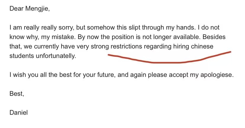 The USA sanctions on 10043 have evolved to troublesome study visa check with more than half of a year - Canada’s security check, the UK’s ATAS review, Australia’s research-based master’s and doctoral review, European countries restrictions like Netherlands, France, Switzerland and Belgium. The figure shows the rejection letter I received from a French university on the second day of President Macron’s friendly visit to China in 2023.